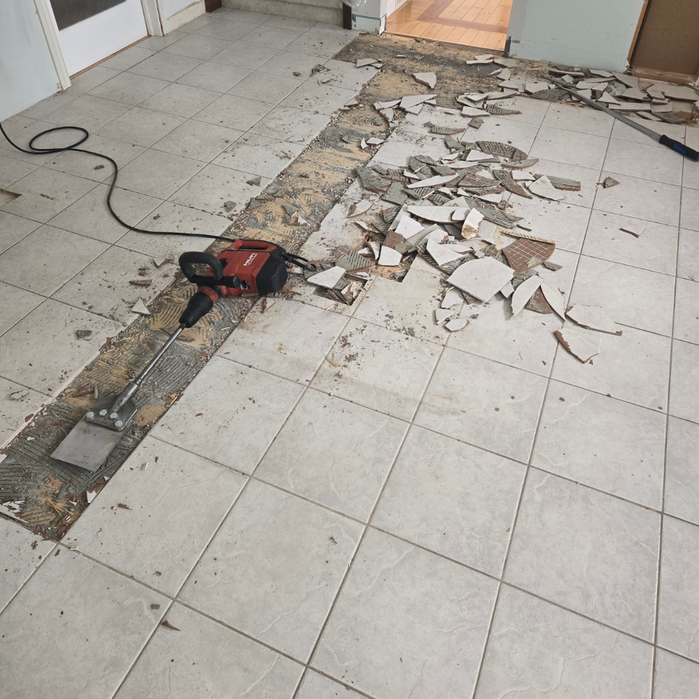 Professional removal of existing flooring and careful subfloor preparation to create a clean, level foundation ready for a flawless hardwood installation.
